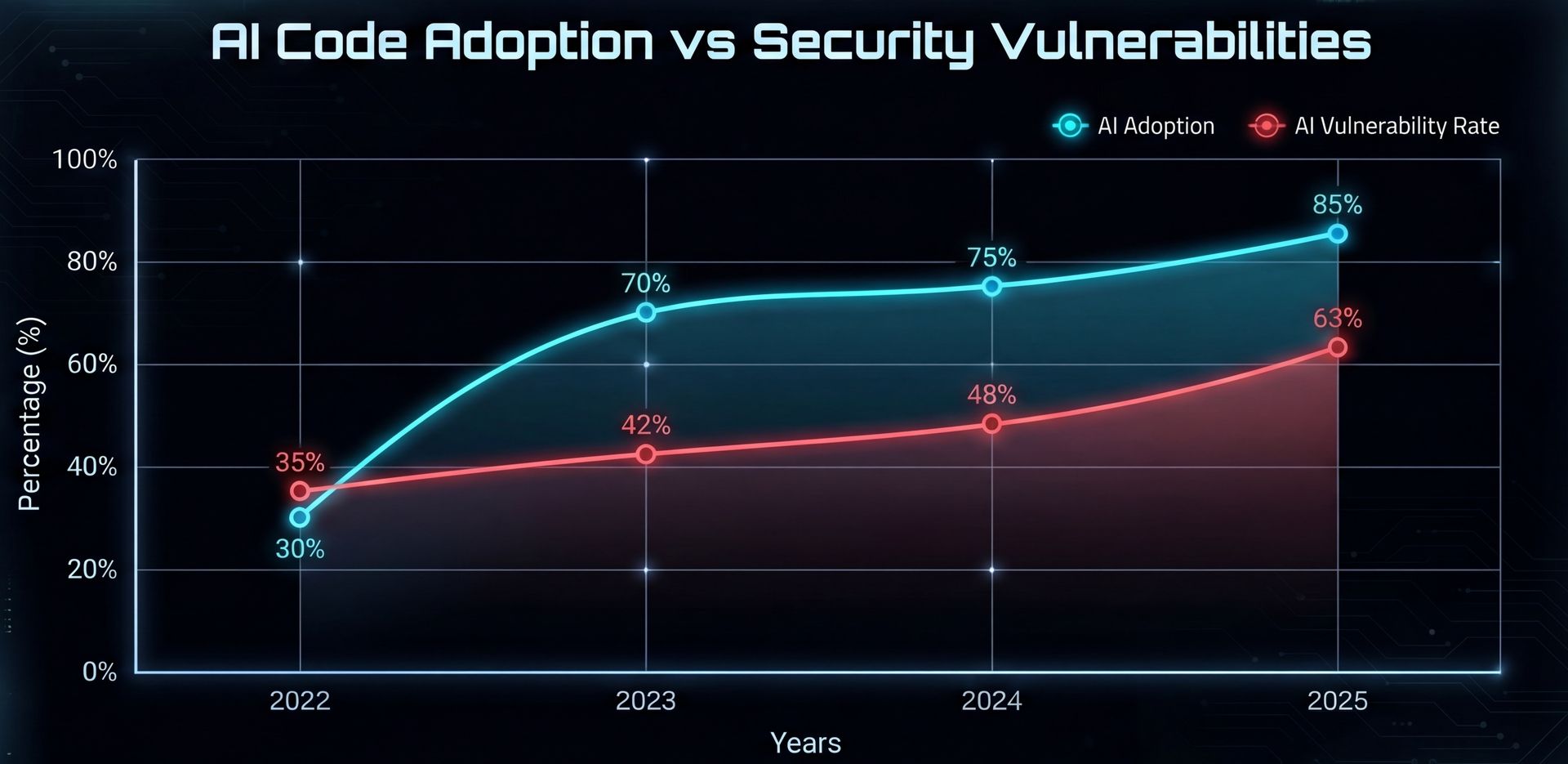 Then there's the AI problem. Nearly half of all AI-generated code contains security vulnerabilities. We're shipping faster and breaking more.